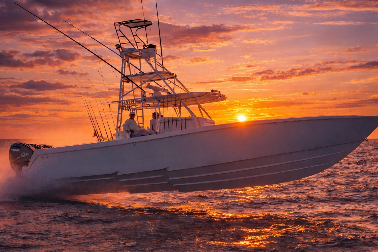 Suncoast Fleece Hoodie — Est. 2023 Sunset Boat Graphic