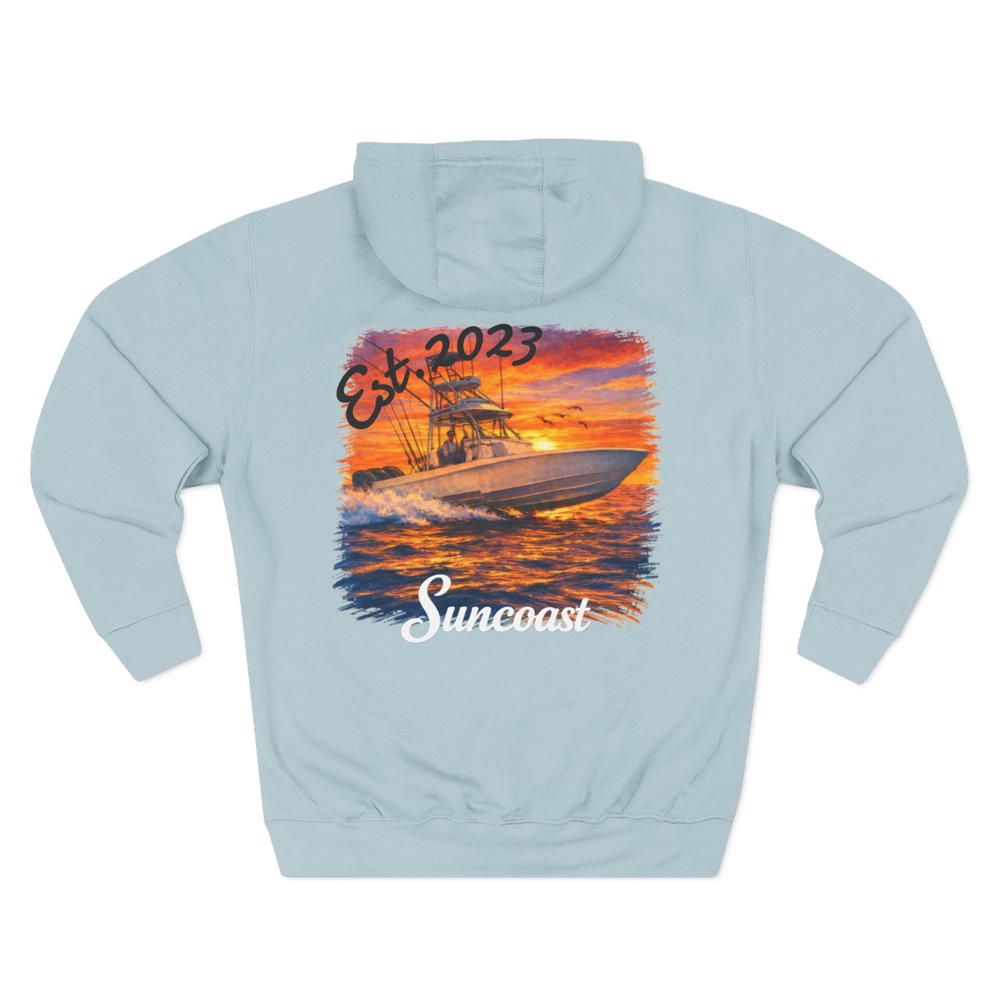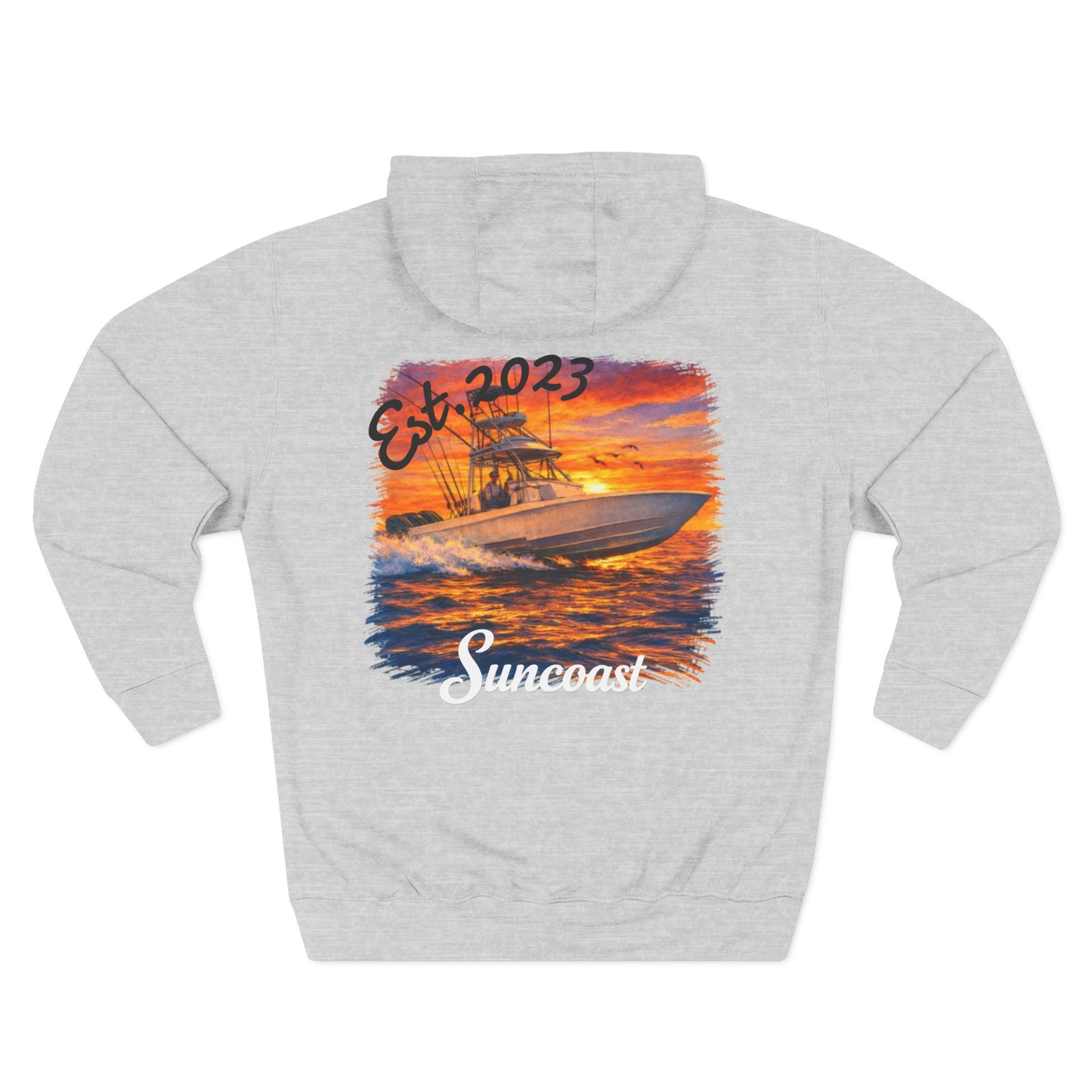 Suncoast Fleece Hoodie — Est. 2023 Sunset Boat Graphic